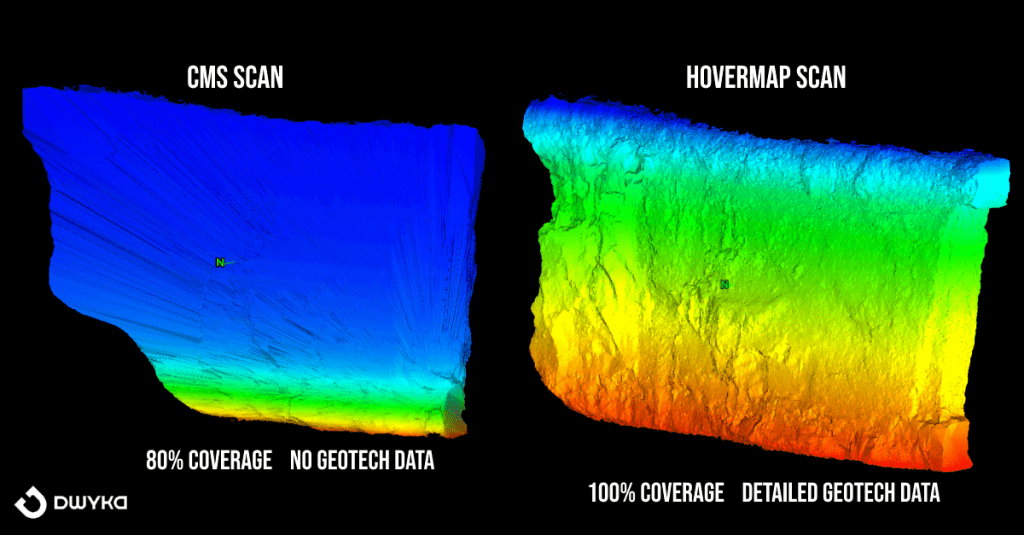 The image below shows a CMS and Hovermap scan of the same stope. The Hovermap scans produced amazing quality, near 100% coverage, and detailed geotechnical information. In contrast, the traditional boom-mounted CMS scans achieved 80% coverage, at best, and left the surveyors adjusting triangles to estimate the volume. With Hovermap, the mine survey team receives accurate volumes straight from the data and believe “it’s 100 times better than a boom scanner”.